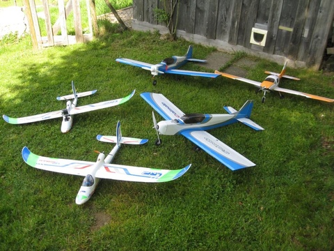 Zur Zeit fliegen wir mit zwei Calmato von Kyosho, einer Cessna Corvalis und zwei Upstream von LRP. Von den Upstream wurde einer umgebaut als Kamera-Flieger um immer mal wieder ein paar schöne Luftaufnahmen zu machen.